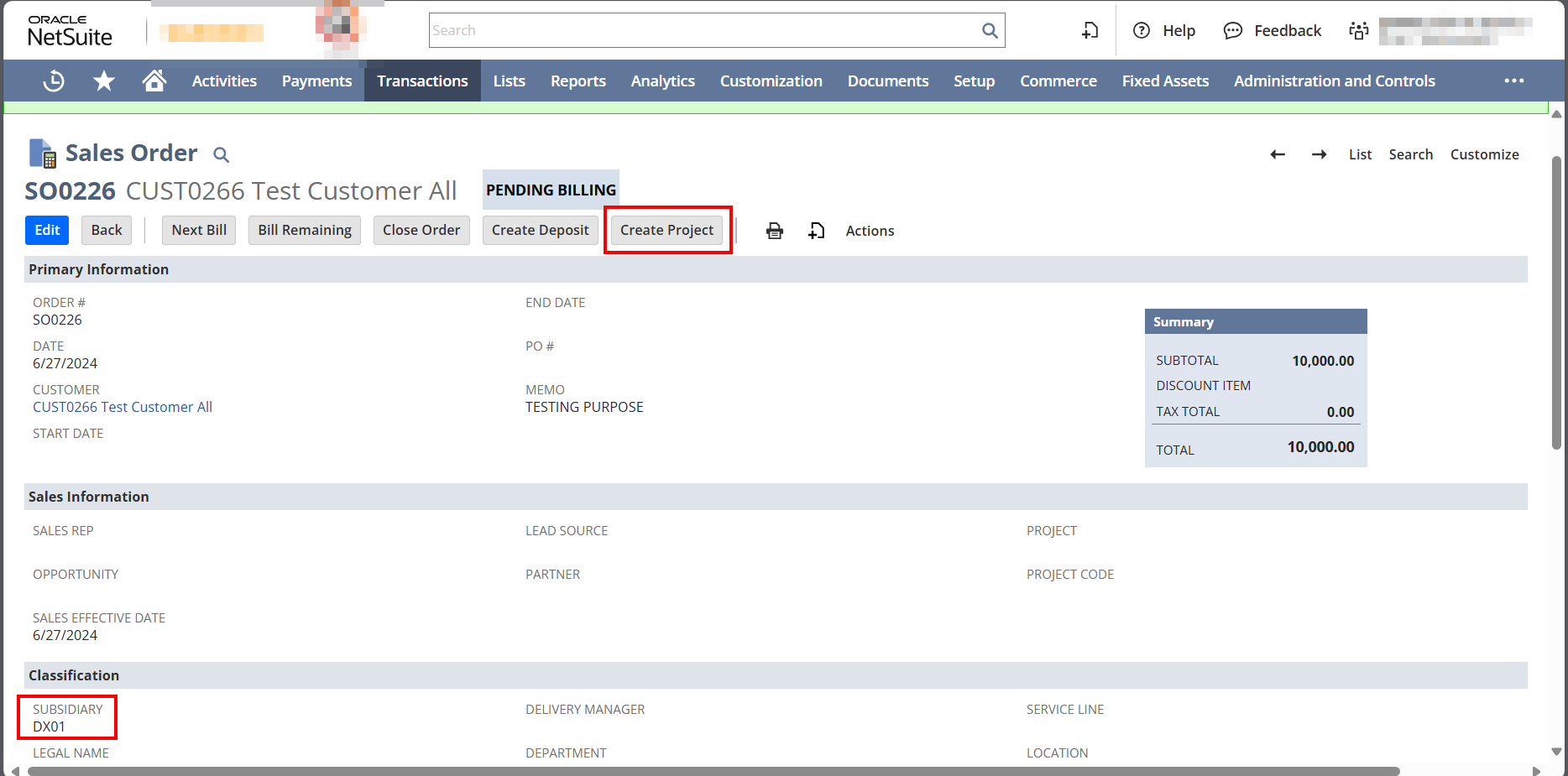 While creating a project record from a sales order, the transactions subsidiary is populated to the project.