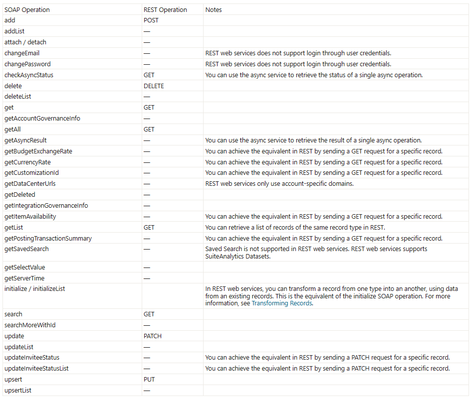 SOAP Web Services vs. REST Web Services Operation Mapping. The following table maps SOAP operations to their corresponding REST equivalents.