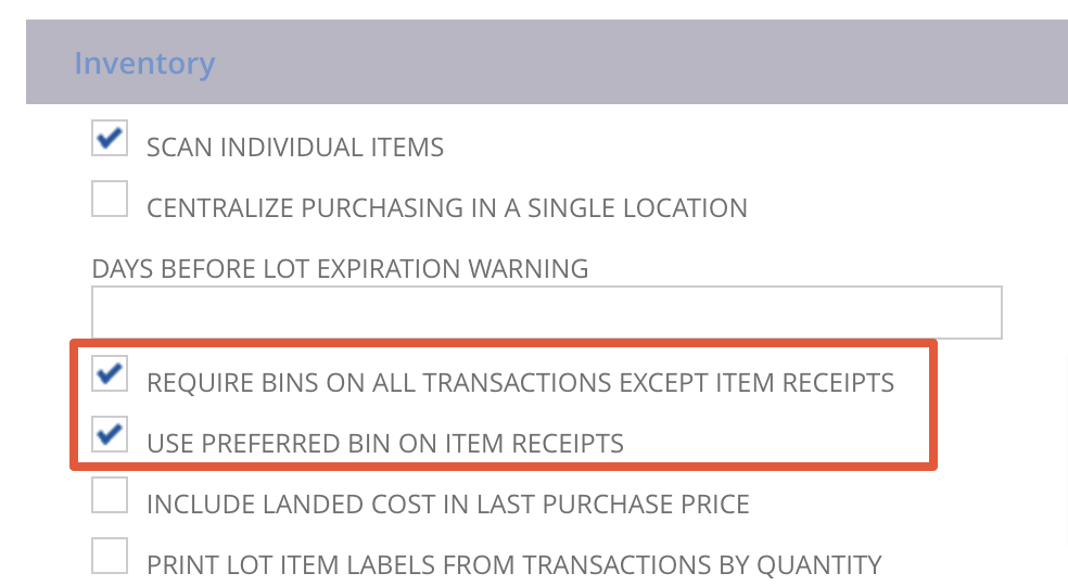 When you enable this preference, the Bin field on item receipts defaults to the preferred bin instead of leaving the field blank.
