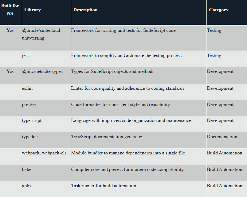Here’s a list of build-time compatible libraries that specifically work with SuiteCloud projects: