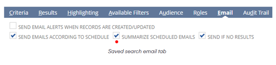 For most use cases that require emailing saved search results to specific recipients, it is critical that the “Summarize Scheduled Emails” check box is checked. When checked, the recipient will receive a single email with the summarized saved search results. When unchecked, the recipient will receive an email for every saved search result i.e. 1000 saved search results = 1000 emails, 10,000 saved search results = 10,000 emails, etc.