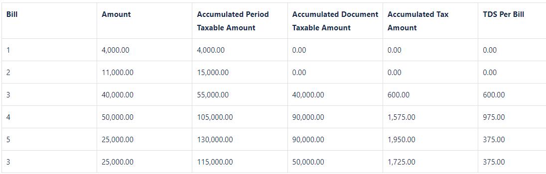 Bill 5 is charged by 375.00 ((130,000.00 x 1.5%) – 1,575.00; or 25,000.00 x 1.5%) since the Year Threshold was crossed and the Year Threshold Amount has been charged with TDS Liability. Since it did not meet the Document Threshold, the amount of Accumulated Document Taxable remains the same.
