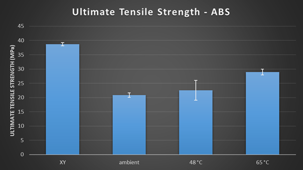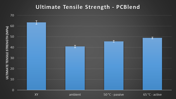 - Actively Heated Chamber (65°C): The samples exhibited a significant improvement, breaking at an average of 29 MPa—almost 50% stronger than those printed in the open environment.