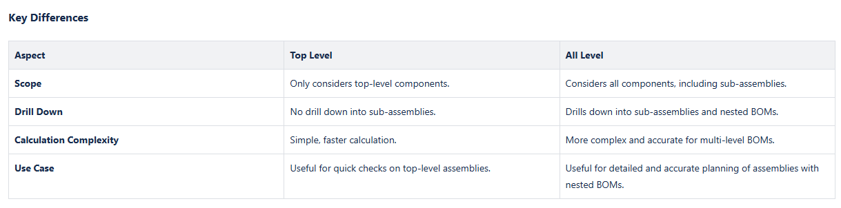- The Top Level calculation only considers the components that are directly listed in the Bill of Materials (BOM) of the assembly item.