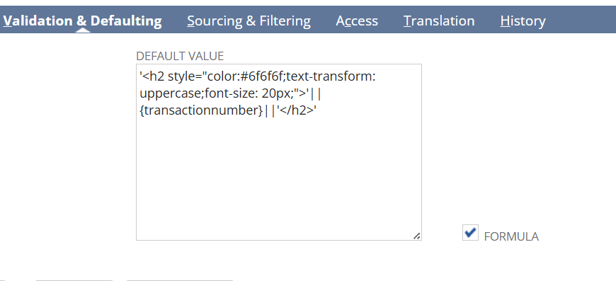 ‘<h2 style=”color:#6f6f6f;text-transform: uppercase;font-size: 20px;”>’||{transactionnumber}||'</h2>’
