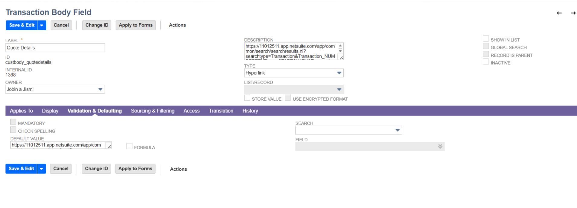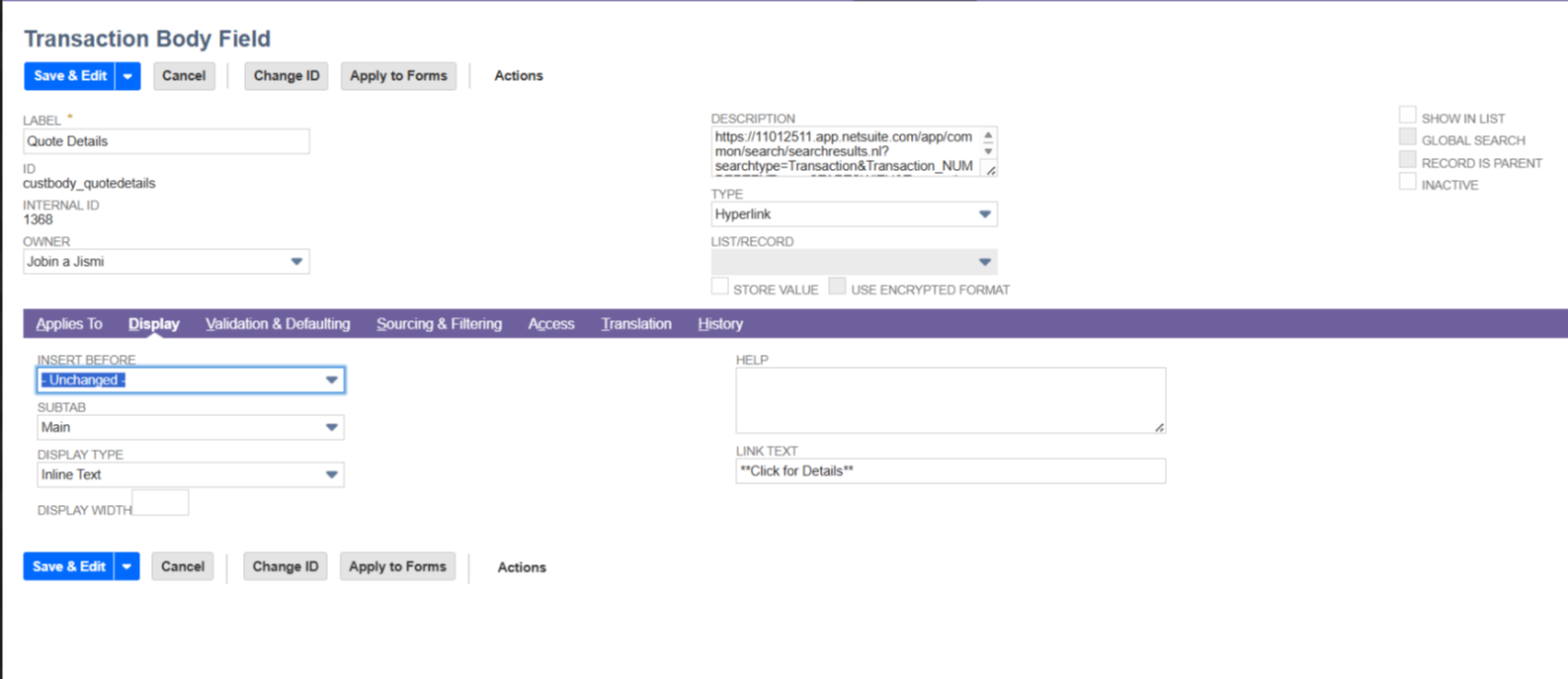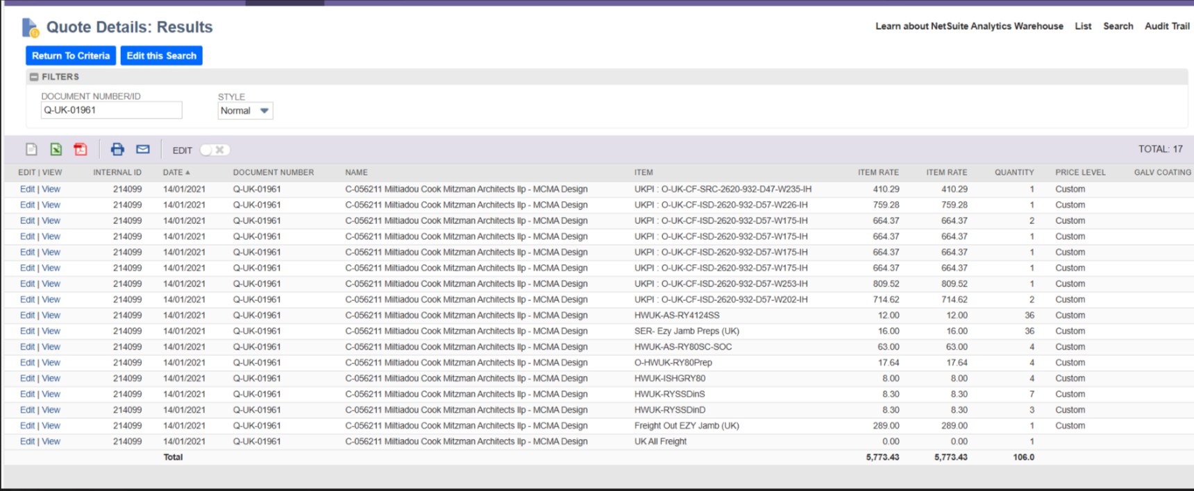 This returned the results of all the item level details of all quotes in the system. However, a custom hyperlink was added in the Primary Information of the quote to navigate to a different tab ,displaying the item level details of the quote, when clicked.