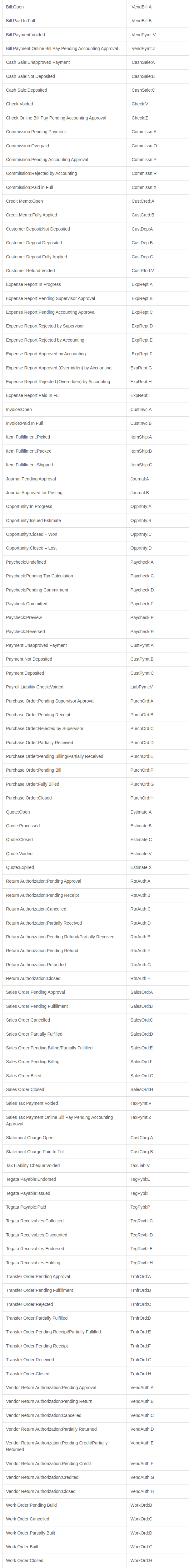 NetSuite does not explicitly list these status codes in its documentation. Instead, these codes can be extracted from NetSuite’s HTML or internal system behavior. Each status corresponds to a specific code used in SuiteScript.