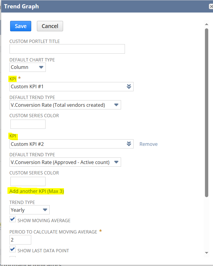 - Click Set Up in the portlet or in the portlet menu and use the KPI list to select the KPI to be used for this trend graph. You can select up to three.