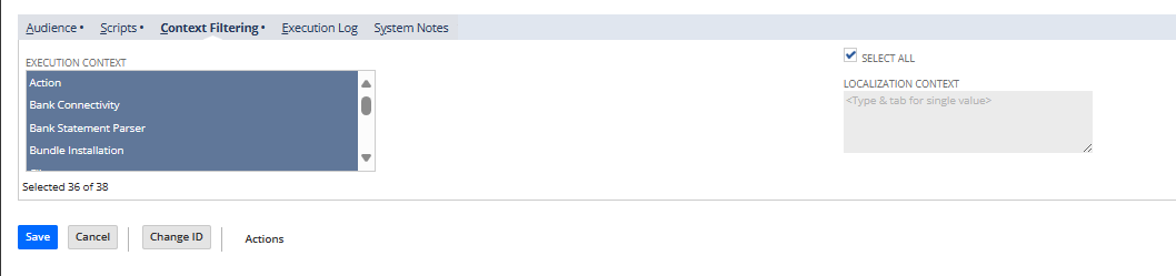 Execution contexts provide information about how or when a client script or user event script is triggered to execute. For example, a script can be triggered in response to an action in the NetSuite application, or an action occurring in another context, such as a web services integration. We can use execution context filtering to ensure that your scripts are triggered only when necessary. We can specify that a script should execute only in certain contexts, and this filtering can improve performance in contexts where the script is not required.