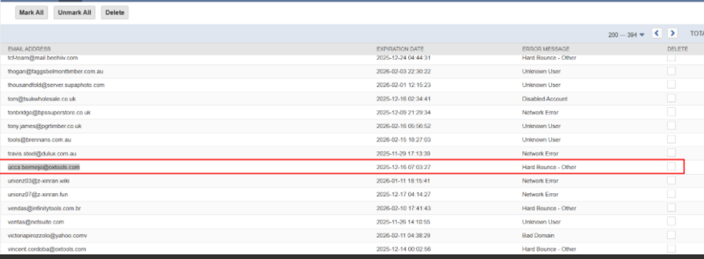 Once an email address is marked as bounced, no further emails will be sent to it until it is either automatically removed (on the expiry date) or manually deleted from the list. In this case, the address is scheduled to be automatically removed on December 16. Alternatively, it can be manually removed by selecting the checkbox DELETE and clicking the delete button.