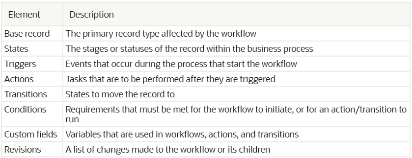 Workflows contain many different elements including record types, events, and actions. The following table provides a general overview.