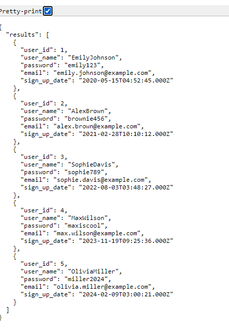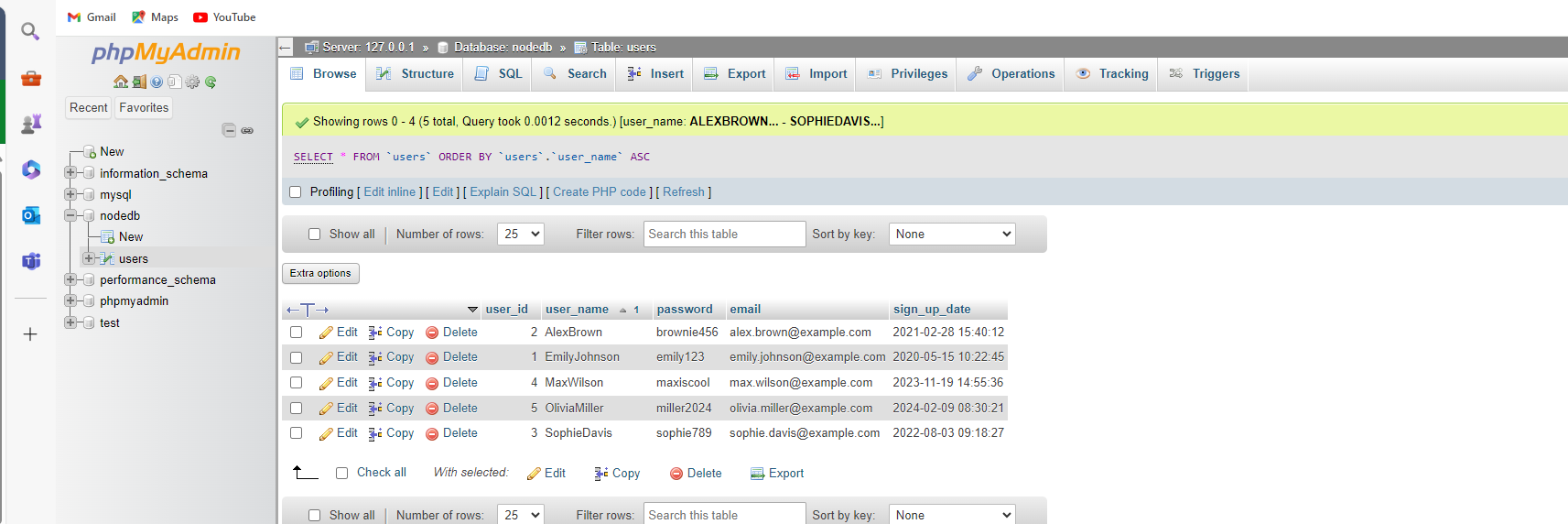 I have created a table width database name “nodedb” and table name users. I have entered some values in the columns, and I have to get the values as API in the frontend.