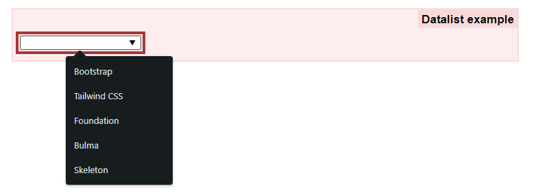 <input list="frameworks" /> <datalist id="frameworks"> <option>Bootstrap</option> <option>Tailwind CSS</option> <option>Foundation</option> <option>Bulma</option> <option>Skeleton</option> </datalist>