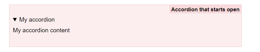 <details open> <summary>My accordion</summary> <p>My accordion content</p> </details>